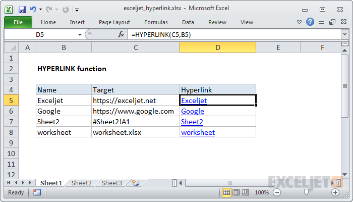=HYPERLINK(“https://exceljet.net/”,”exceljet“)