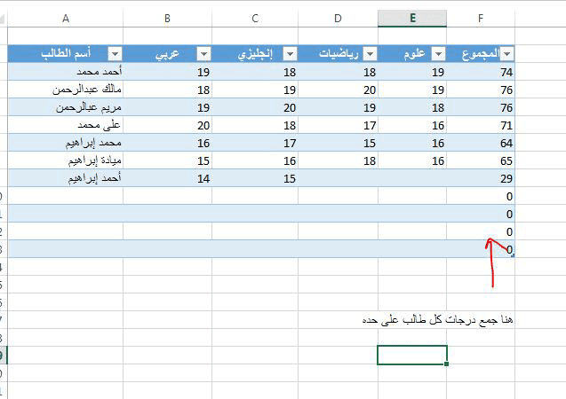 اسم مريم عبد الرحمن، ففي هذه الحالة سنجمع درجاتهما الموجودة في العمود E، كما هو موضح في الصورة التالية: