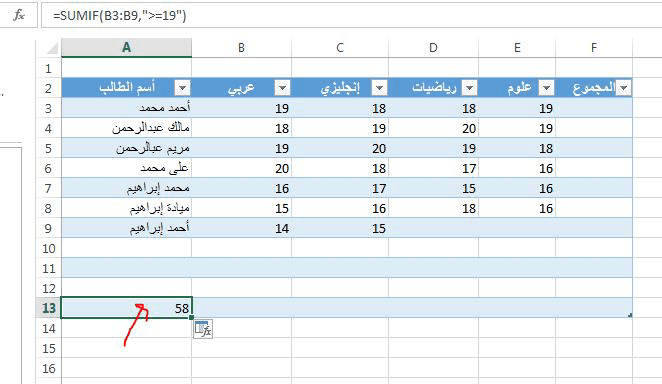 مادة اللغة العربية، الأكبر من 19، ومادة اللغة العربية متمثلة في العمود B، فنحدد الخلايا من B3:B9 وهم الطلاب الموجودين لدينا، ثم نكتب الشرط