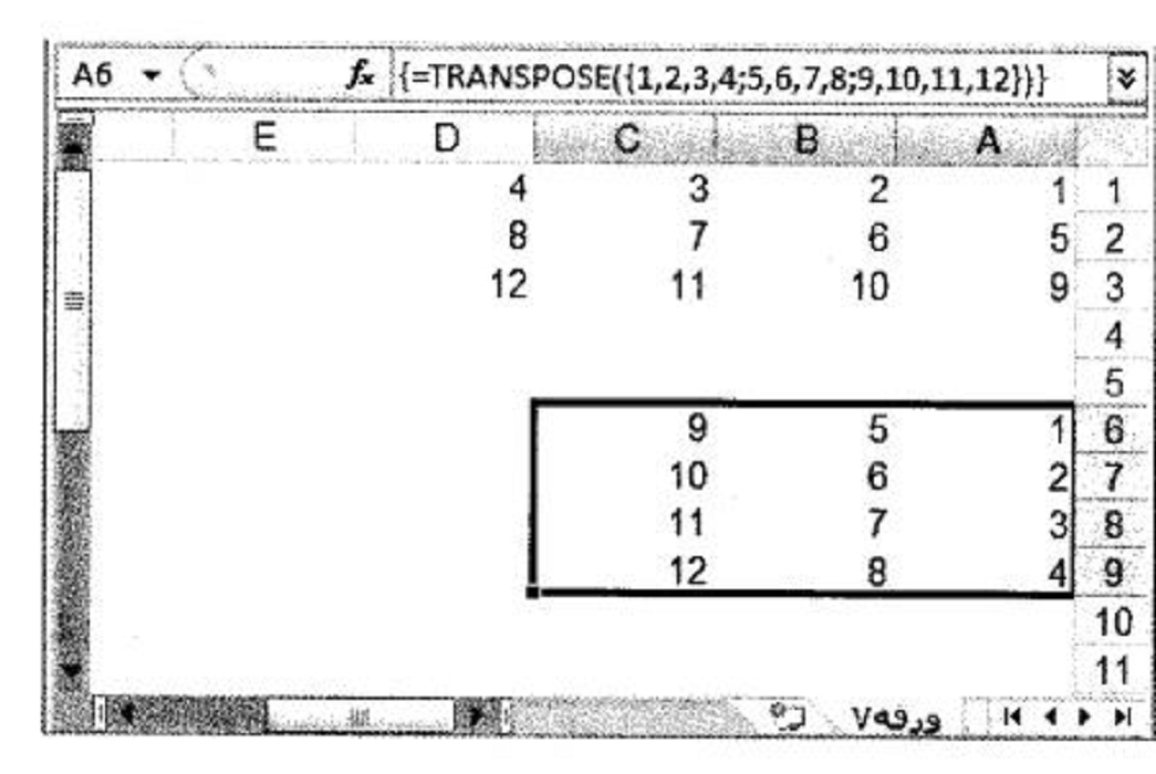 معين بشكل طبيعي، كما تم إدخاله في نطاق آخر باستخدام الدالة TRANSPOSE. حيث يحوي النطاق A1:D3 صيغة الصفيف التالية: