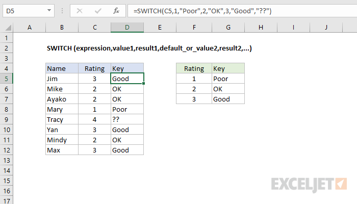 =SWITCH(C5,1,”Poor”,2,”OK”,3,”Good”,”??”)